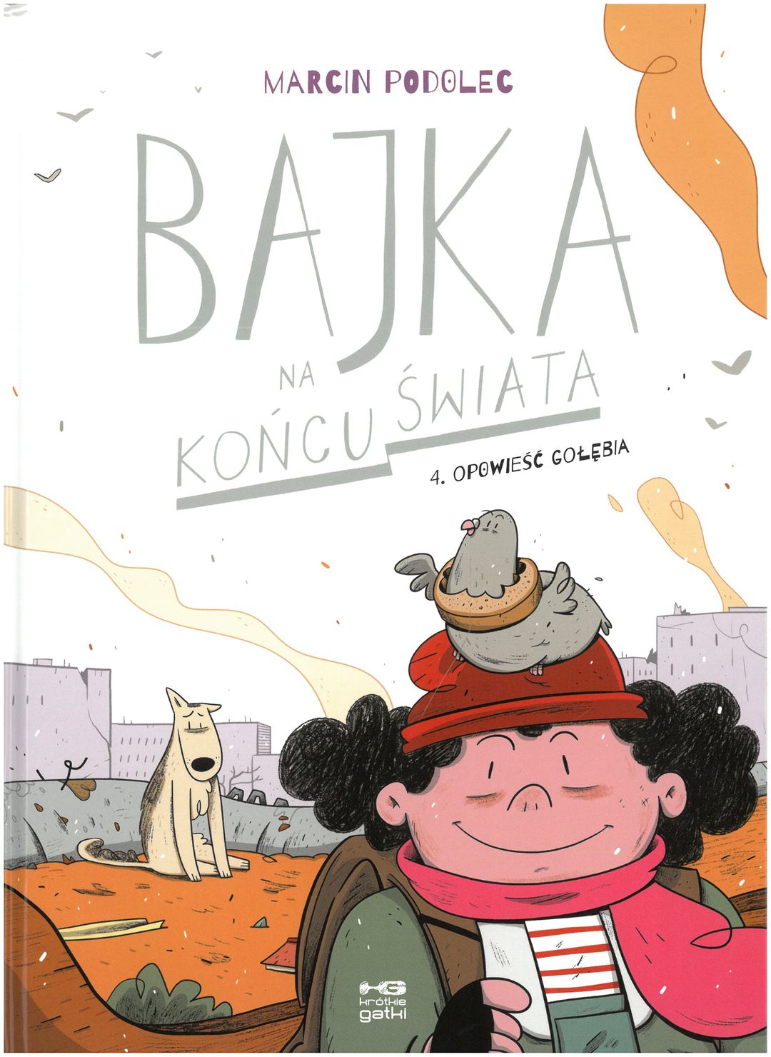 Wiktoria i Bajka wędrują, by odnaleźć rodziców. Mijają dymiące kratery, wymarłe lasy i gruzowiska. Jak okiem sięgnąć – nieprzytulne widoki. Świat po wielkim wybuchu to zdecydowanie nie miejsce dla dziewczynki i psa. Ale jeśli już mamy tam dziewczynkę i psa, pozostaje nam trzymać za nie kciuki! „Bajka na końcu świata. Opowieść gołębia” to już czwarty tom postapokaliptycznej serii dla najmłodszych autorstwa Marcina Podolca, jednego z najzdolniejszych polskich twórców komiksów i animacji. Prawa do serii zostały sprzedane do Francji, a na jej podstawie powstaje właśnie animowany serial. [nota wydawcy]